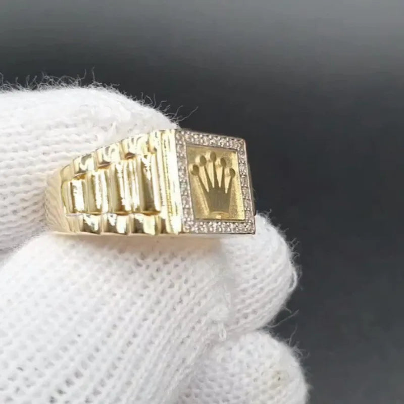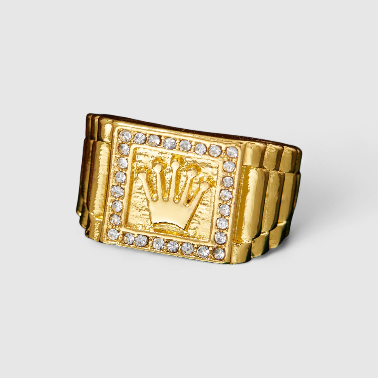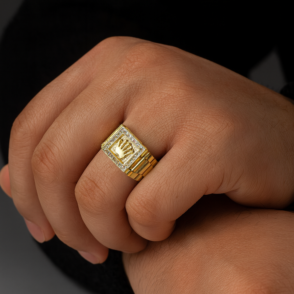 Tento masivní pánský prsten vyzařuje čistou autoritu. Vyrobený z vysoce leštěného zlata s ikonickým motivem koruny na přední straně, orámovaný precizní řadou třpytivých kamínků. Statement piece pro ty, kteří svůj status nevysvětlují — ale ukazují.