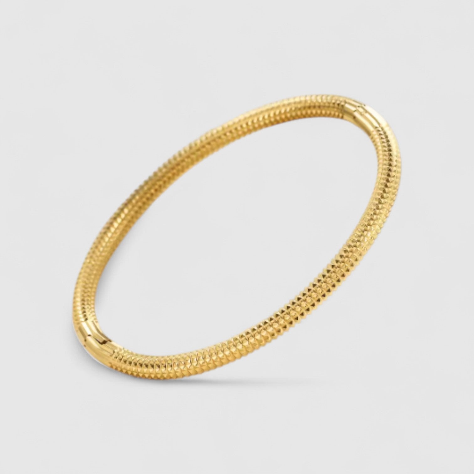 Strukturovaný zaoblený náramek. Tento pevný náramek z nerezové oceli má strukturovaný zaoblený design, je voděodolný a neoxiduje, což mu dodává nenápadnou eleganci.