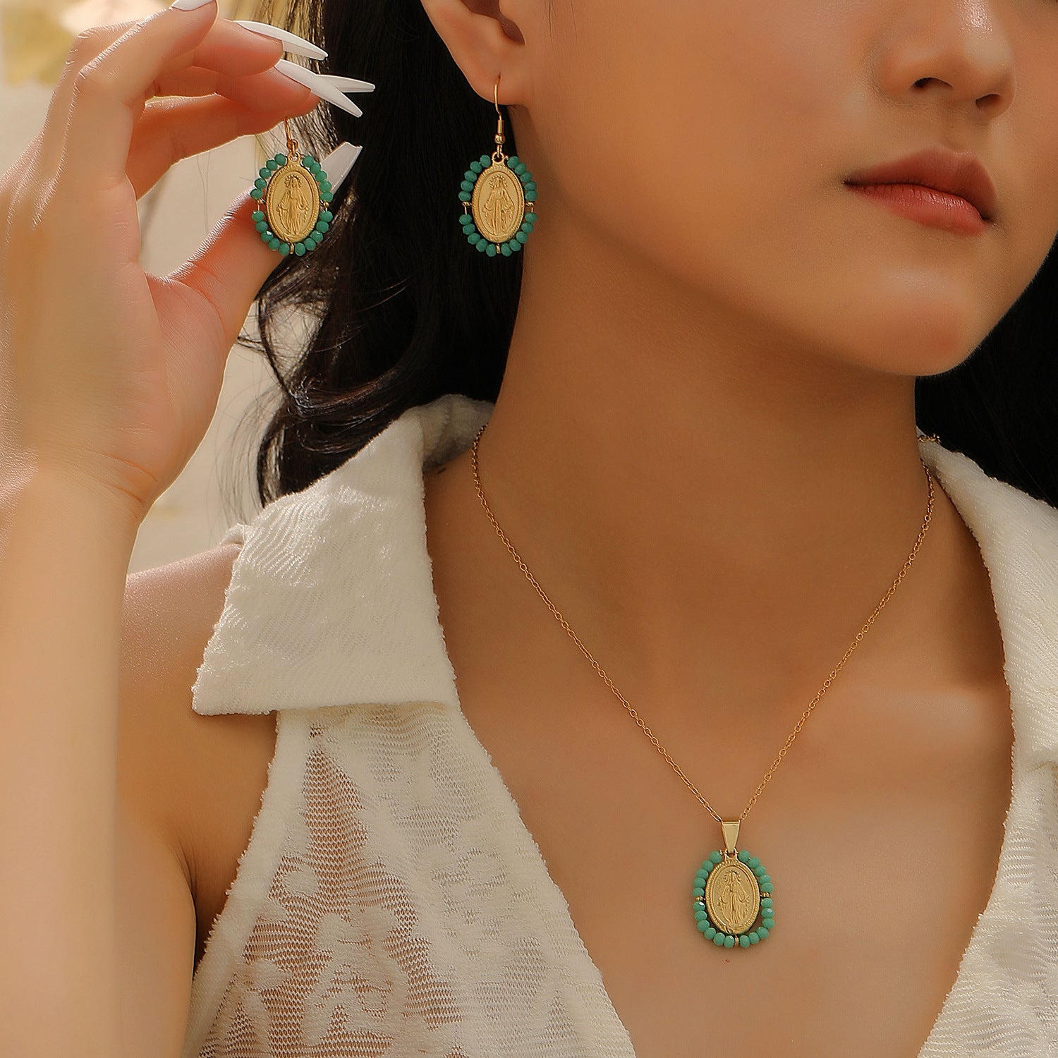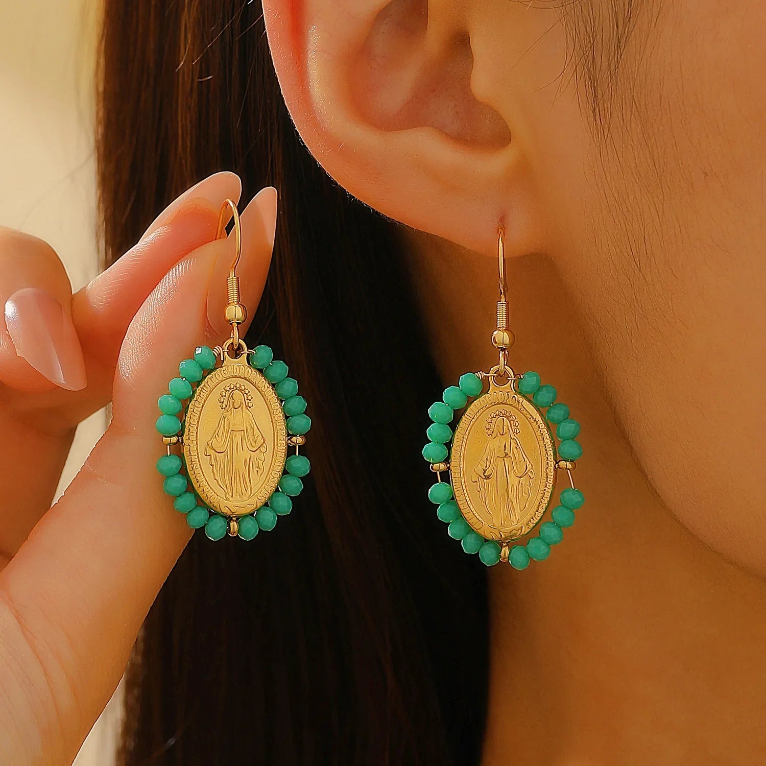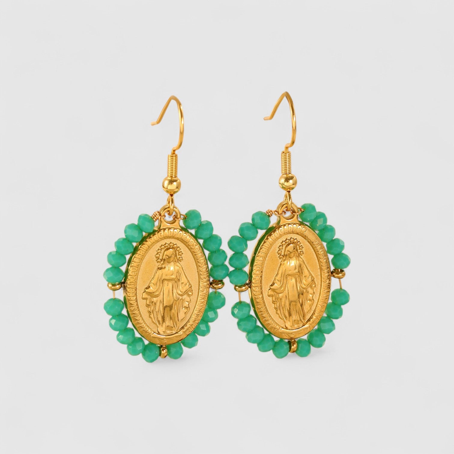 Tyto nádherné náušnice s Pannou Marií spojují spiritualitu a styl v jednom silném šperku. Zlatý přívěsek s vyobrazením Panny Marie, lemovaný jemnými korálky, vyzařuje víru i eleganci. Perfektní pro slavnostní příležitosti i jako každodenní symbol síly a ochrany.