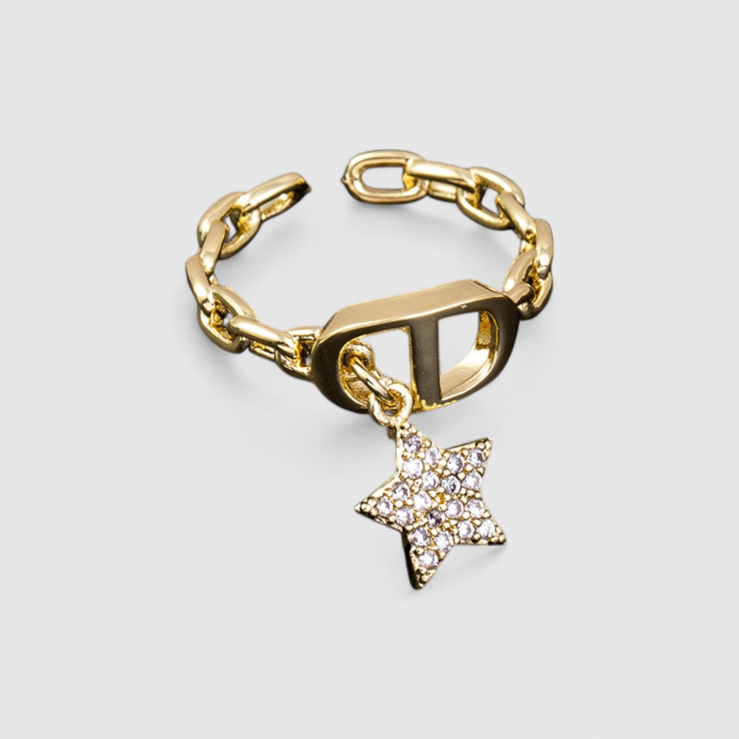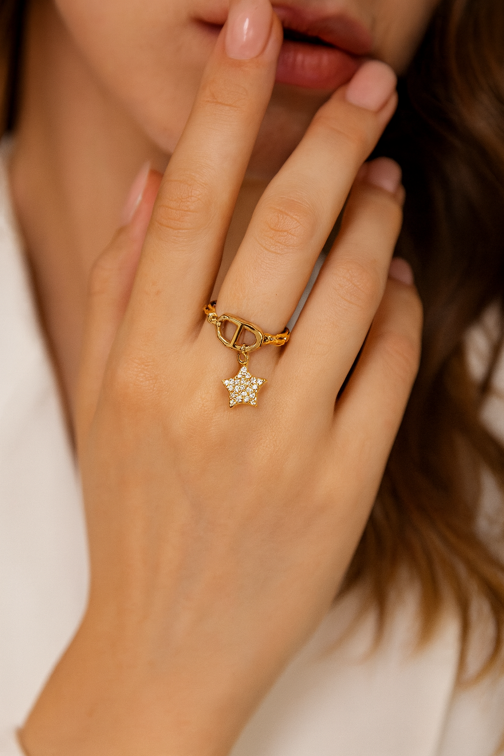 Nechte svůj styl zářit s elegantním zlatým prstenem s hvězdou. Tento jemný, ale výrazný šperk spojuje luxusní zlatý řetízkový design s třpytivým přívěskem hvězdy osázeným mikro zirkony. Ideální pro ty, kteří chtějí vyniknout s noblesou.