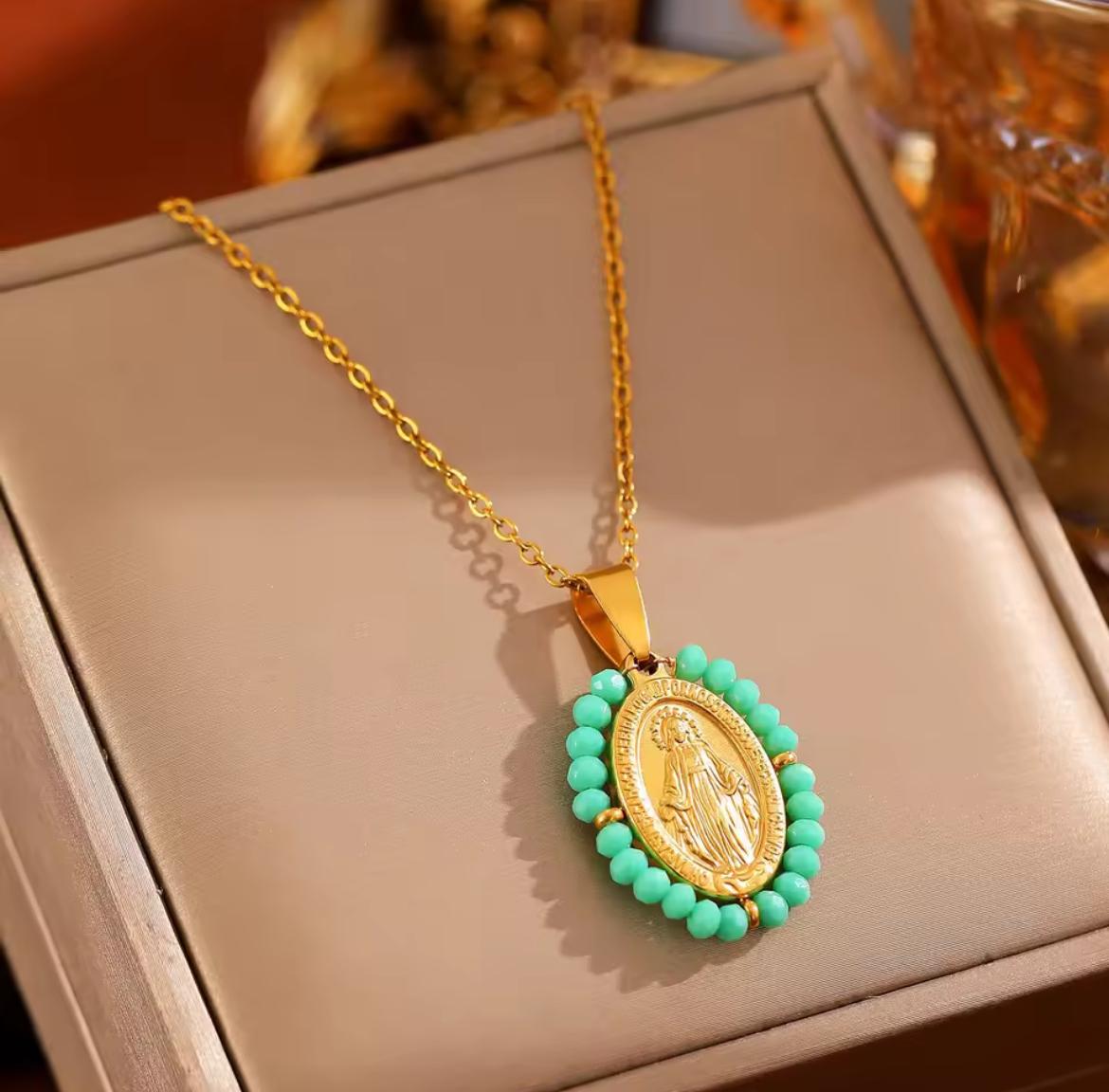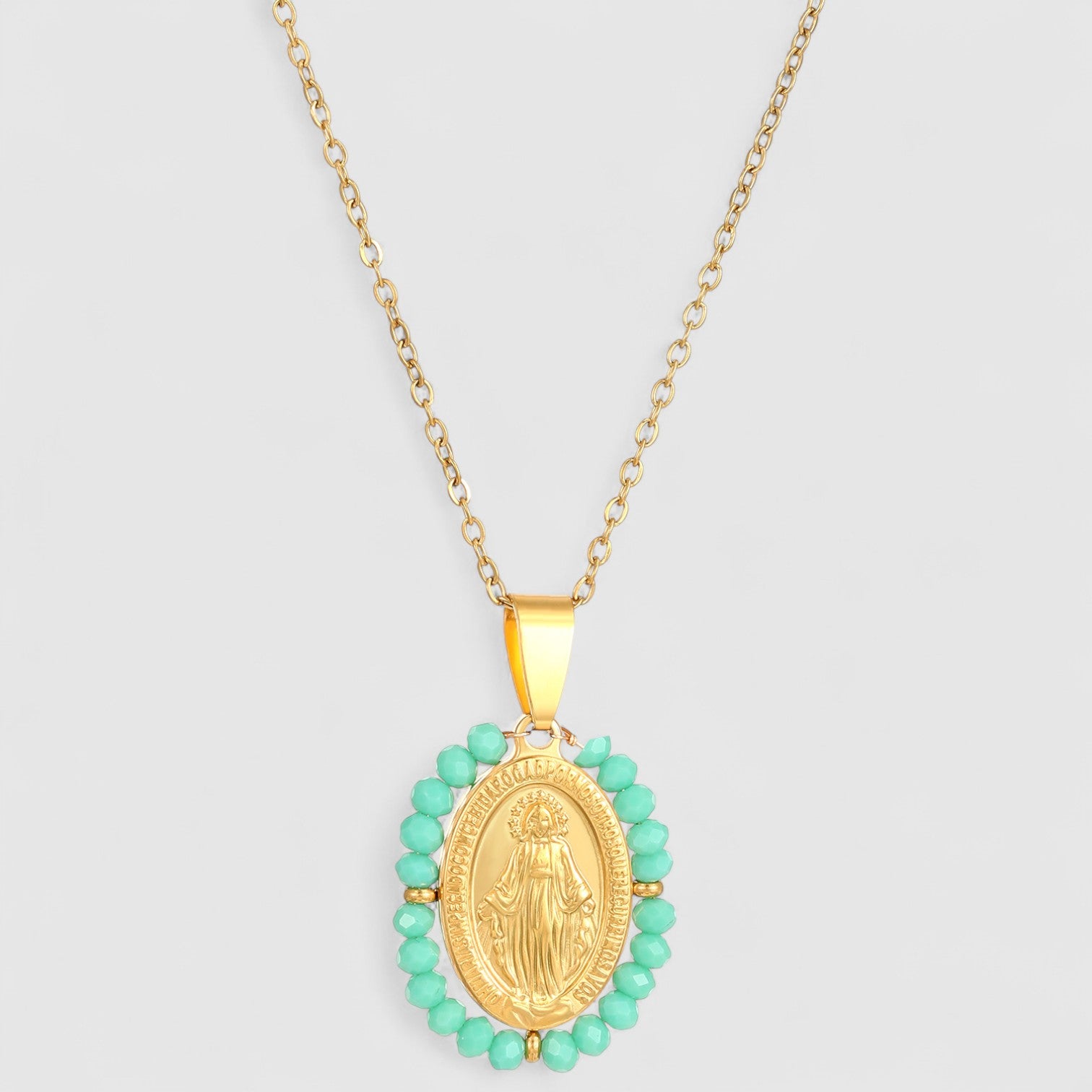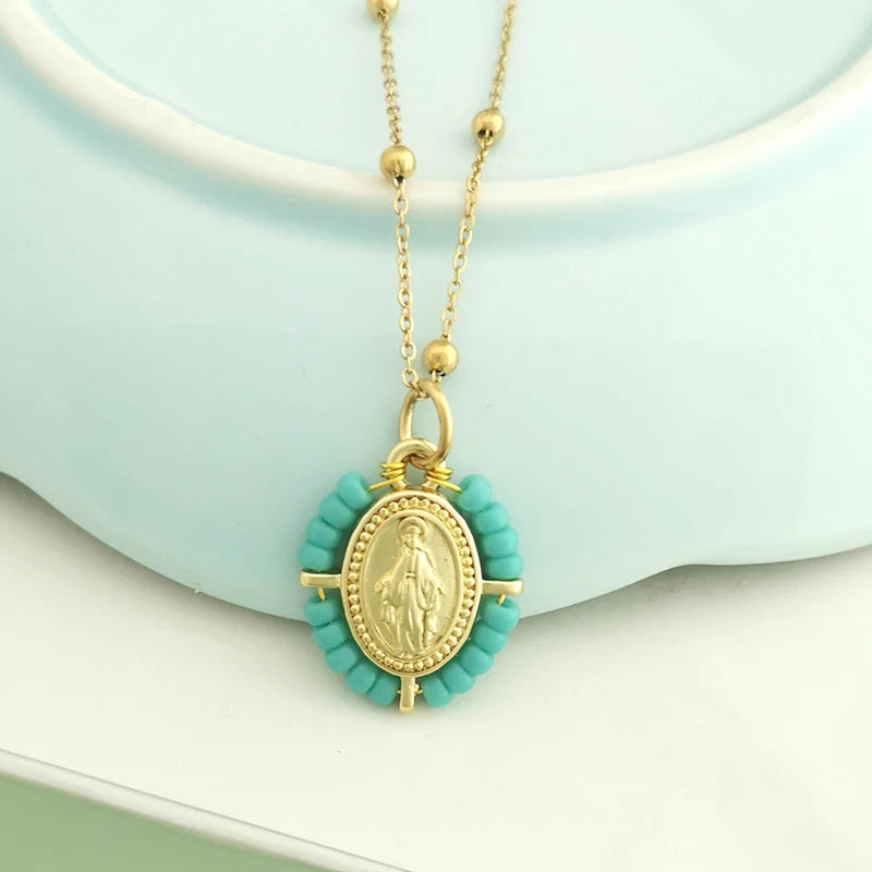 Symbol víry a elegance. Tento nádherný náhrdelník s přívěskem Panny Marie je orámován jemnými korálky a vyzařuje spiritualitu a nadčasovou krásu.