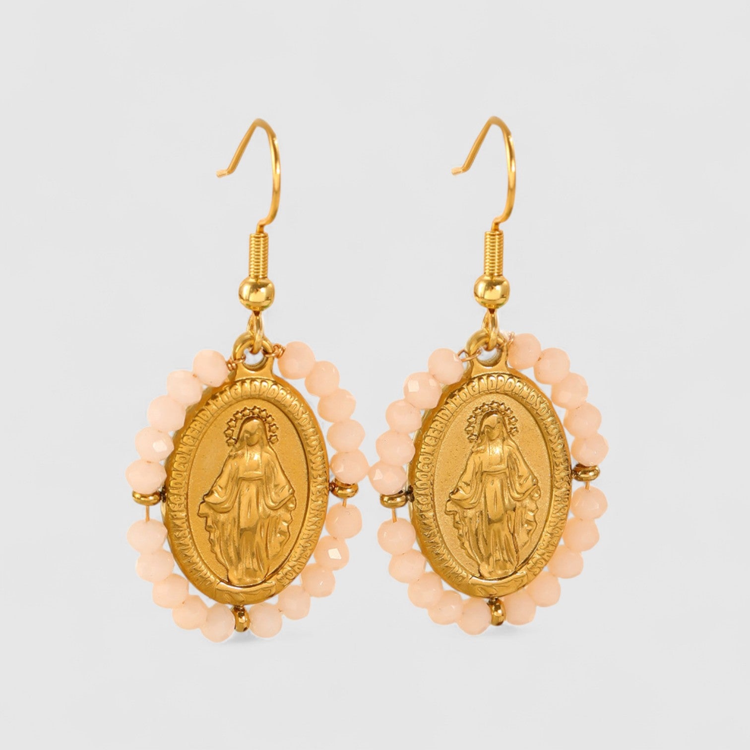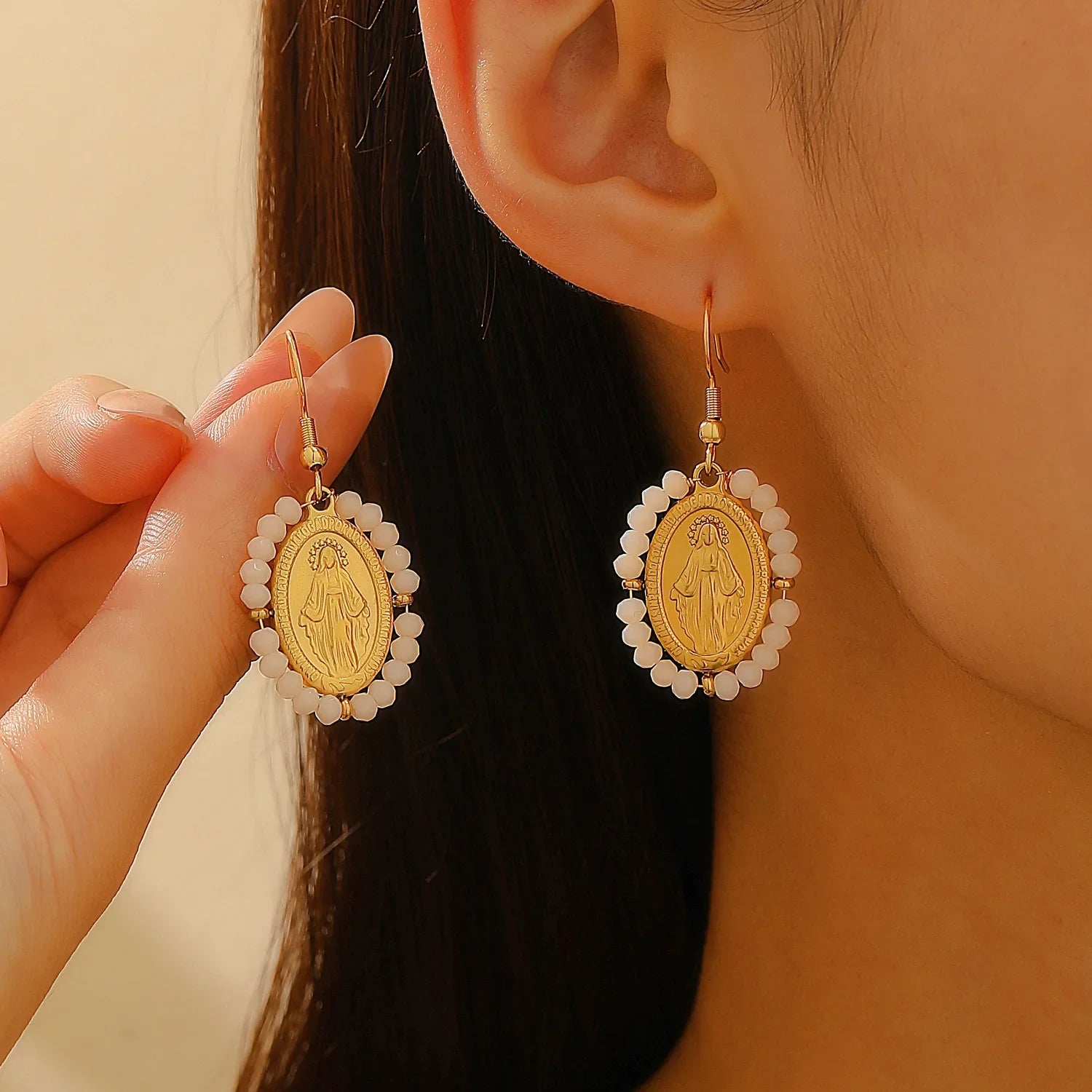 Tyto nádherné náušnice s Pannou Marií spojují spiritualitu a styl v jednom silném šperku. Zlatý přívěsek s vyobrazením Panny Marie, lemovaný jemnými korálky, vyzařuje víru i eleganci. Perfektní pro slavnostní příležitosti i jako každodenní symbol síly a ochrany.
