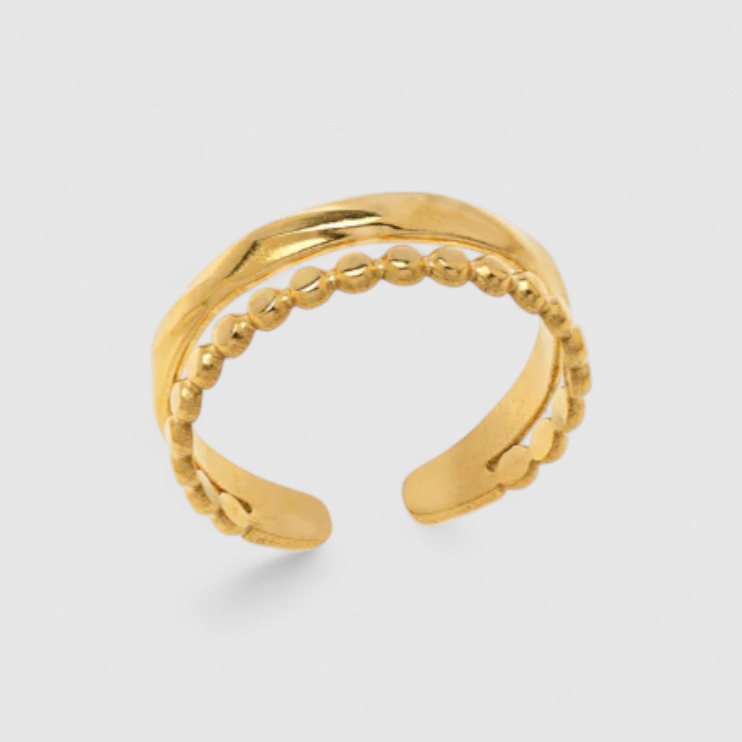 Stohovatelný styl s tímto dvojitým prstenem. Tento minimalistický prsten z nerezové oceli má dvojitý design, je voděodolný a neoxiduje, takže se dá kombinovat s dalšími prsteny.